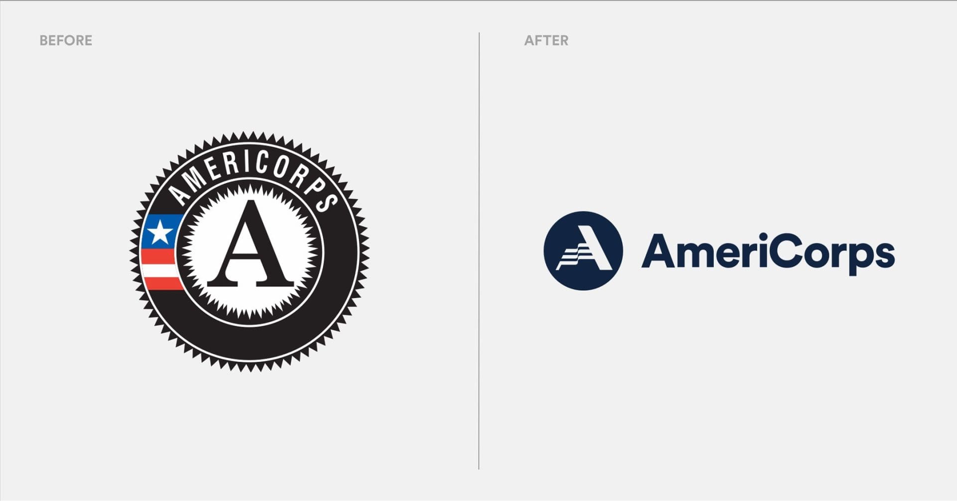 Prior to our work there had been a proliferation of sub-brands with multiple names, logos and identities. We brought the organization together under a single name (AmeriCorps) with a new logo featuring three stripes that form the crossbar of an ‘A’ and create a symbolic flag.